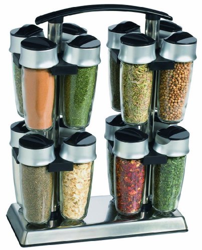 * Revolving Bottle Holders * Design Uses Minimal Counter Space * Easy To Use Twist Caps * Filled With 16 Savoury Spices * Satin Stainless Steel / Silver And Black * 4 X 9 X 12" / 23 X 10 X 30 Cm