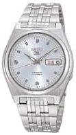 Hidden behind the Seiko Men's Automatic Stainless Steel Watch's classic analog design are high-tech progressive elements like a day and date function in two languages (English and Spanish) and precise 21-jewel Japanese automatic movement, a feature that means this watch never needs batteries or winding; it is powered automatically by the movement of your arm. Time of day is displayed on a silver-toned analog dial that showcases luminous silver-toned hands and luminous silver-toned baton hour markers. The dial also features a day and date window at the three o'clock position, and is protected by a Hardlex crystal and backed by a stainless steel case. Keeping all of this securely on your wrist is a stainless steel link bracelet that closes with a double-push-button fold-over safety clasp. Other features include a custom crown at the four o'clock position and water-resistance to 99 feet (30 meters).