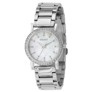This ladies DKNY watch features a stainless steel case and bracelet. The watch has a mother of pearl dial with gem dot hour markers and a stone set bezel.