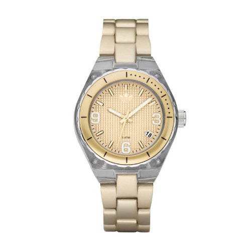 Adidas ADH2537 Aluminum Cambridge women's watch features a 35mm wide and 13mm thick transparent nylon plastic case with stainless steel fixed bezel and textured crown. Adidas ADH2537 is powered by a reliable Japanese quartz movement. This beautiful watch also features an attractive gold tone textured dial with luminous hands and hour markers, date display window at 4 o'clock, protected by scratch resistant mineral crystal, and water resistant depth is 50 meters. Adidas ADH2537 is equipped with 11mm wide yellow gold tone aluminum bracelet with push button deployment clasp. Adidas ADH2537 women's Aluminum Cambridge transparent nylon gold tone bracelet watch is brand new and comes in an original Adidas gift box and is backed by a 2 year manufacturer warranty.